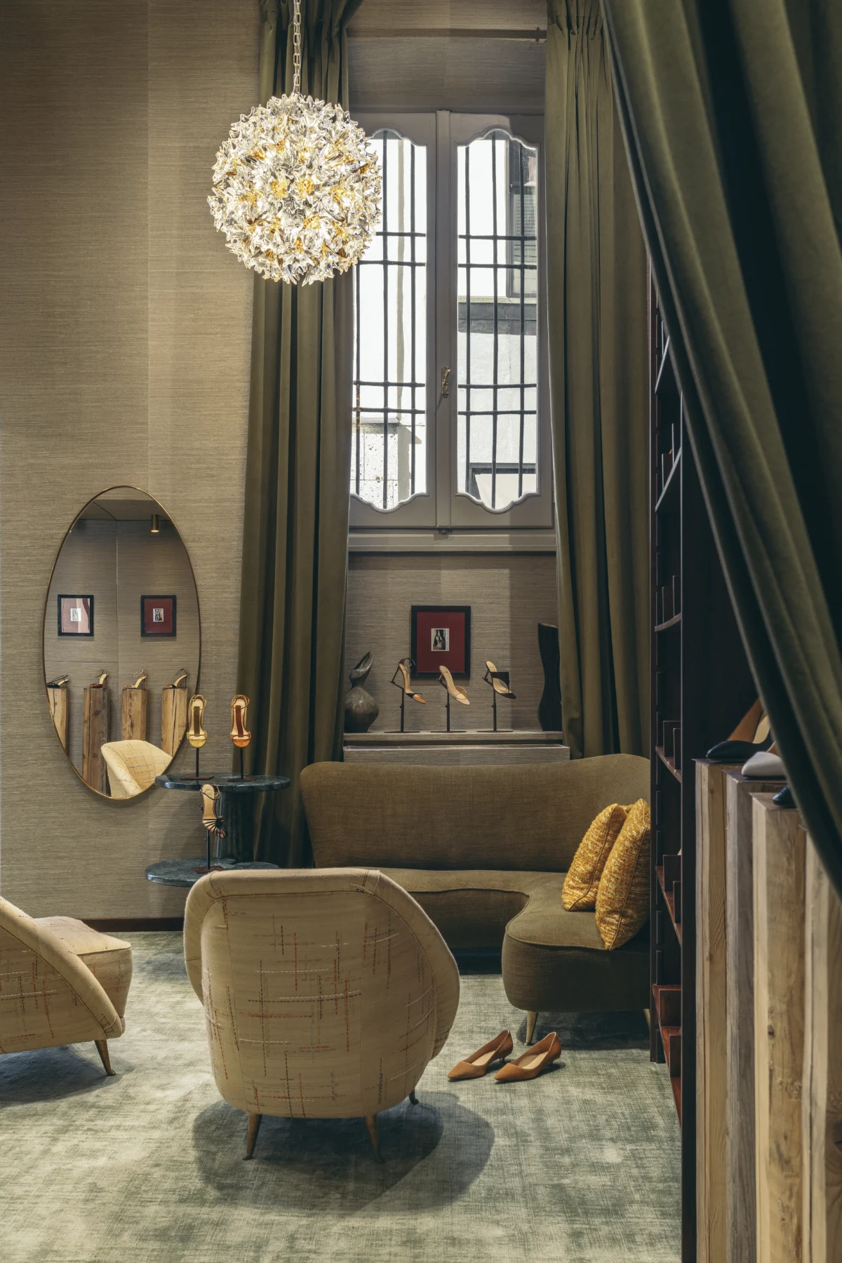 For the interior design of the Milanese flagship, Russo enlisted the expertise of Studio Dini Cataldi. The studio has masterfully translated Russo’s personal vision into a space that feels both luxurious and deeply personal. The boutique recreates a cozy, domestic environment, furnished with carefully selected objects and design pieces drawn from Russo’s own private collection. This deliberate choice imbues the store with a unique character, transforming it into an extension of the designer’s personal world.