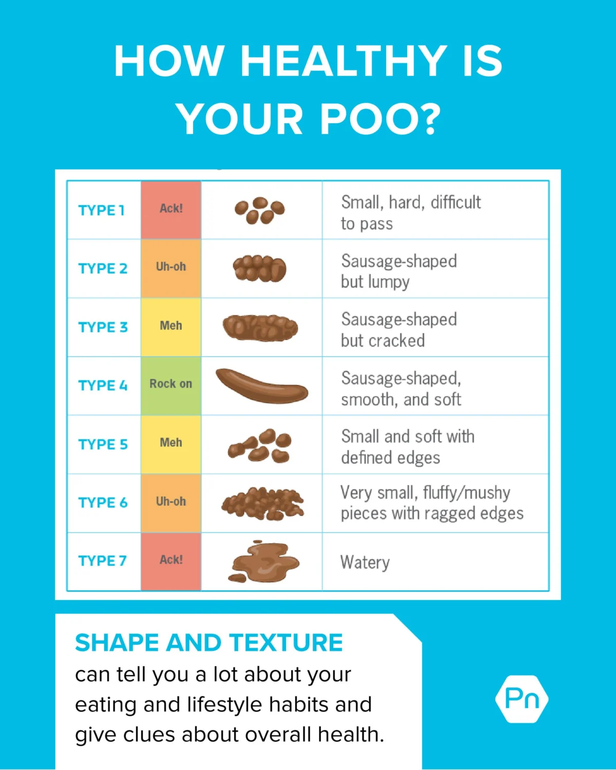- Type 4: Sausage or snake-like, smooth and soft – indicates normal stool.